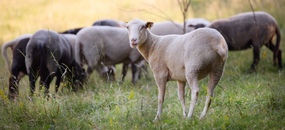 Dès que les premières feuilles poussent sur les vignes et afin d’éviter qu’ils ne les mangent, nous laissons notre troupeau dans les divers prés du domaine, où ils se régalent des enherbements naturels !