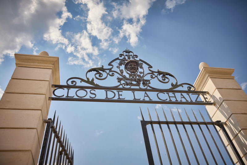 L’impressionnant portail à l’entrée du clos de la Chaize, ceinturé d’un mur en pierre protecteur, est dominé par une représentation de Bacchus, dieu du vin, qui veille sur les meilleures vignes du domaine, toujours planté de Gamay, comme l’ensemble de notre vignoble. On le retrouve également sur la porte d’entrée en bois du Château, et sculpté en pierre au-dessus de cette même porte.
